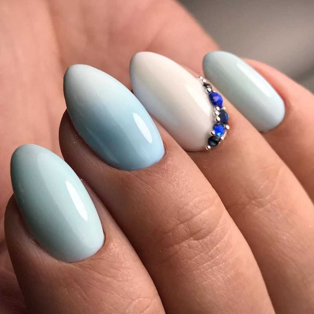 Облака – подходящий вариант выражения голубого и белого цветов. Летнее и наивное, легкое и свободное. Молодежная модификация светлых оттенков маникюра миндаль.