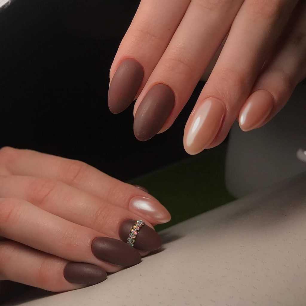 Среди всех новинок дизайна лидером будет матовый. Он очень эффектно выглядит на миндальном ногте, помогает образу приобрести изюминку и роскошь. Бархат отлично сочетается с остальными дизайнами, особенно с росписями и цветами.