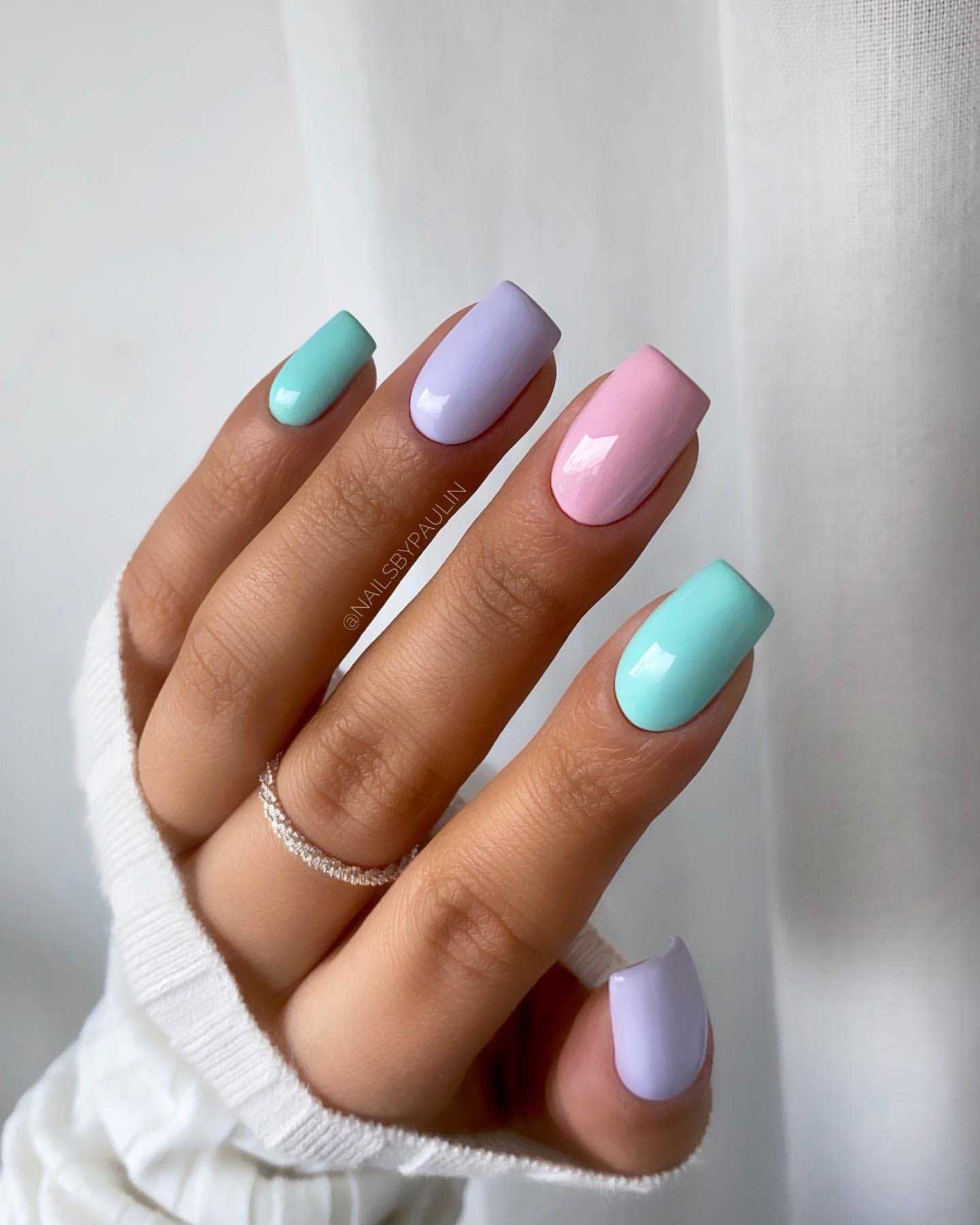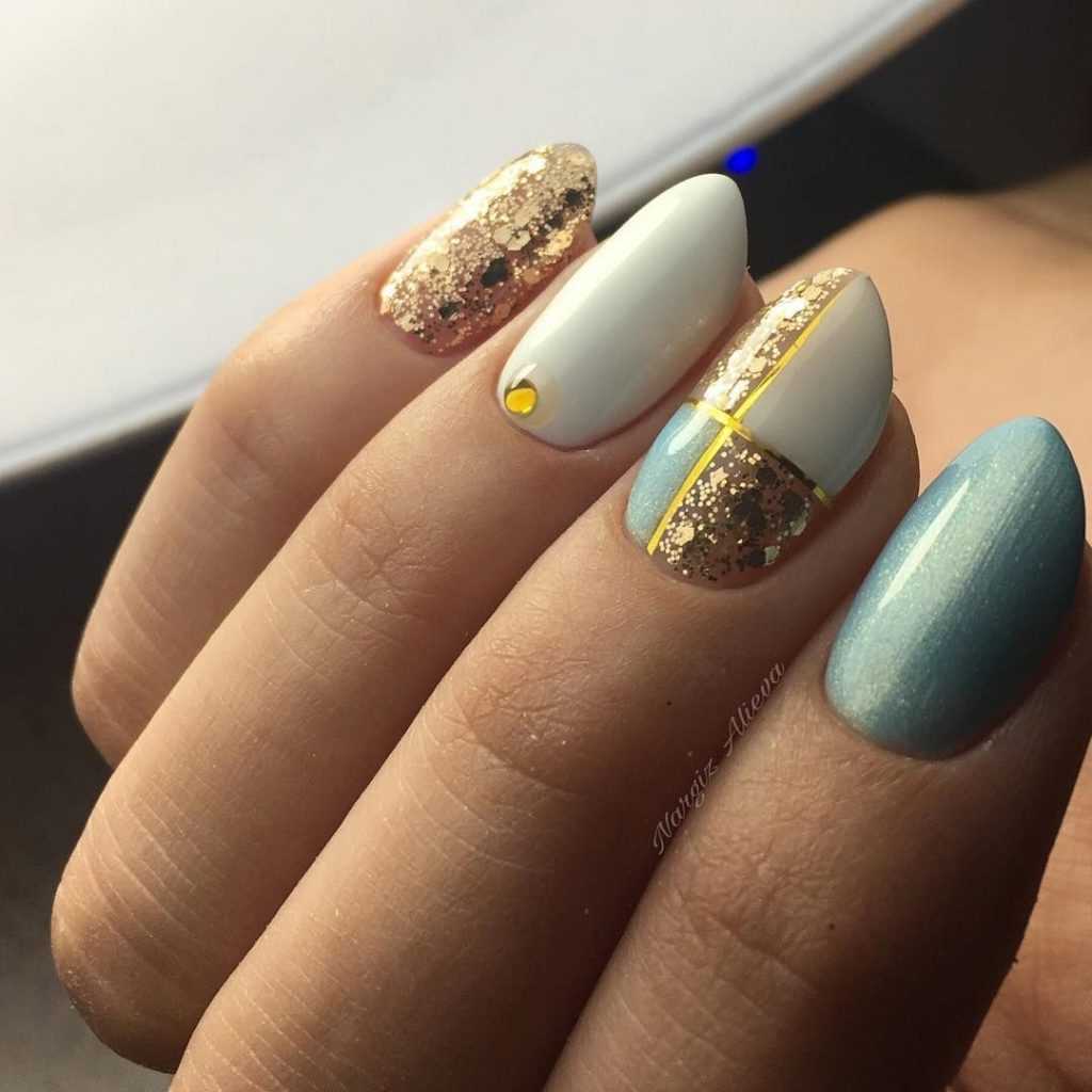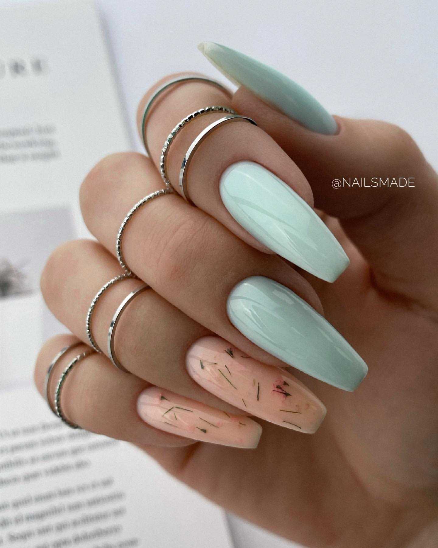 Для выполнения этого маникюра необходим пастельно-мятный и молочно-белый оттенок лака. Указательный и большой палец можно покрасить в молочно-белый цвет, а все остальные пастельно-мятным. Для придания маникюру праздничного послевкусия достаточно воспользоваться цветными наклейками или вручную разрисовать несколько ногтей нежными цветами. Добавьте дизайну сияния с помощью золотой фольги и закрепите свой результат глянцевым топом.