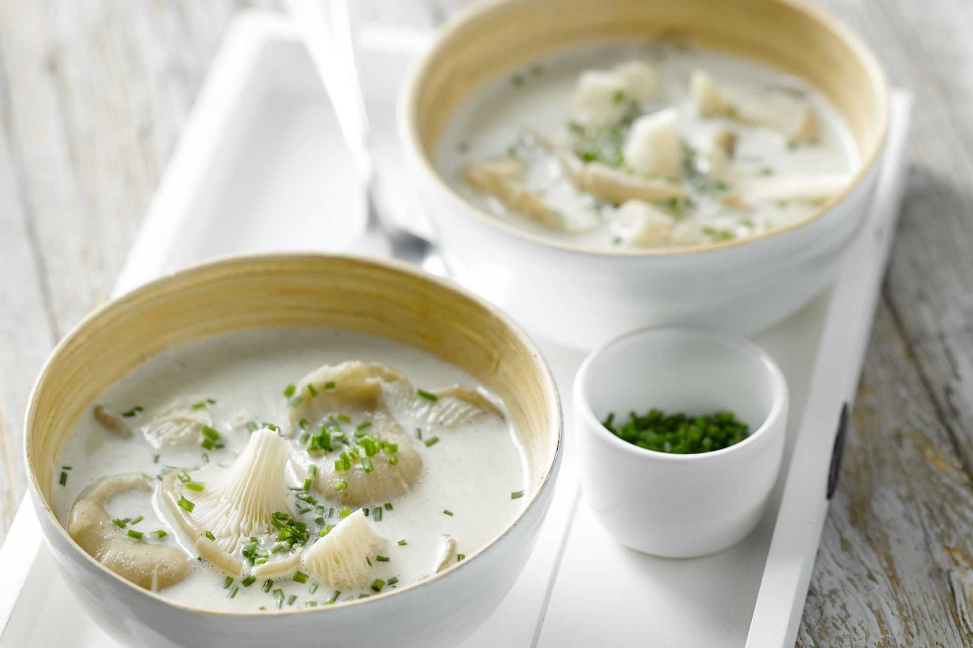 Еще один рецепт подразумевает использование грибов. Свежие шампиньоны для такого блюда следует нарезать мелкими полосками, после чего к ним нужно добавить раздавленный чеснок, лимонный сок, капельку растительного масла. Данный состав следует тушить на медленном огне в сотейнике или сковородке в течение сорока минут. Полученную массу нужно смешать в кухонном комбайне с куриным бульоном. Далее грибной суп-пюре останется лишь разогреть, добавив сливки. Супчик не нужно доводить до кипения, и как только он окажется достаточно горячим, его можно разливать по тарелкам.