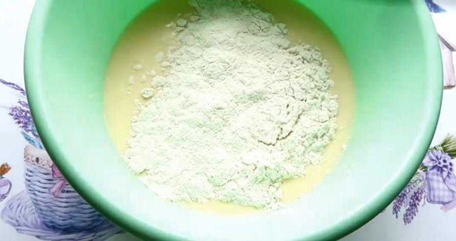 3.Теперь просеивайте муку и вмешивайте ее в водно-яичную смесь. Работайте венчиком до тех пор, пока не получите массу, однородную по своей структуре, матовую и гладкую.