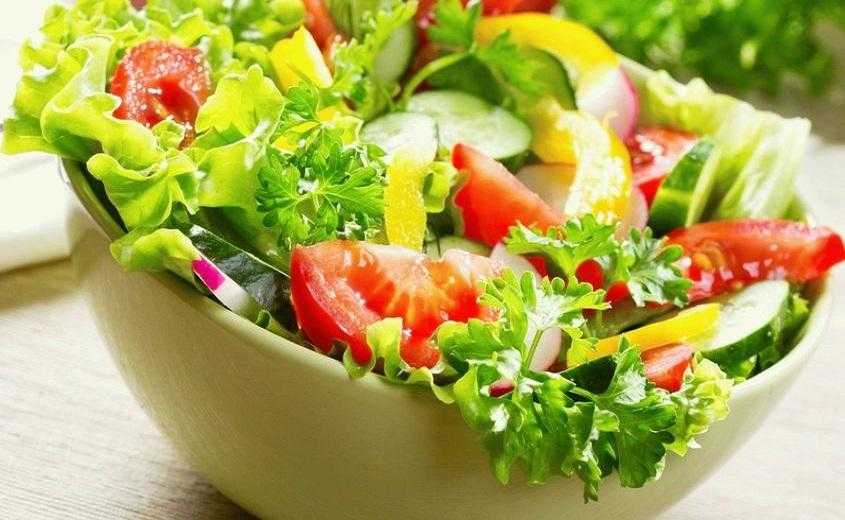 - 150 грамм салата из свежих овощей (огурцов, помидоров, зелени), кусочек цельно зернового хлеба;