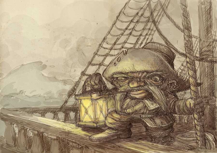 А вот дух средиземноморских кораблейгобелинбыл совсем другого нрава. Днем его было не слышно и не видно, но вот ночью он начинал пакостить: подрезал веревки у гамаков, ставил подножки матросам, несущим вахту, мог засвистеть спящим в ухо. И много воровал, хотя это не точно — возможно, в пропаже денег и табака из карманов виноват был вовсе не гобелин.
