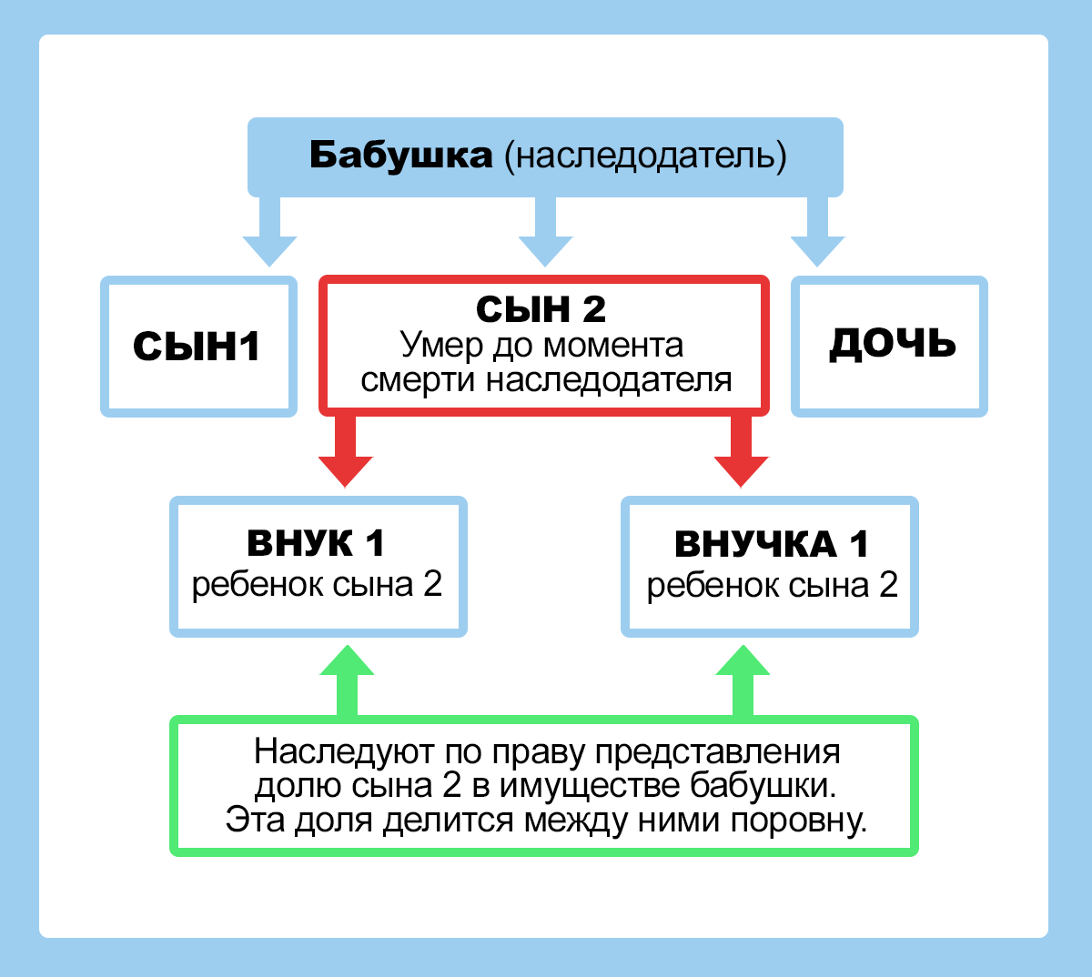 В представленном на схеме примере внуки Сына 2 – это наследники 1 очереди, только их доли в наследстве будут меньше. Они будут делить между собой поровну ту часть наследственной массы, которая полагалась их отцу.