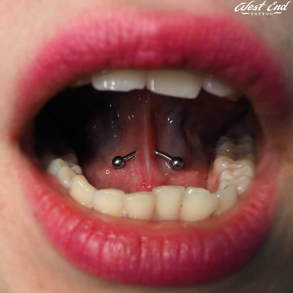Разновидность пирсинга языка – прокалывание уздечки, под языком. Такой вариант менее опасен, быстрее заживает, наиболее удобен (вызывает меньше дискомфорта). Но, в то же время, не у всех возможен в силу анатомических особенностей.