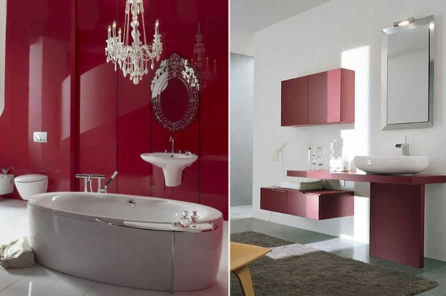 Санузел с отделкой цвета бордо идеально сочетается с белой сантехникой, золочеными, бронзовыми или хромированными кранами. Добавив правильное освещение, зеркала и стильную ванну вы создадите в ванной комнате классический стиль. Как правило, бордовый цвет в ванной присутствует в виде отделки стен, пола и даже потолка. Иногда для светлой отделки подбирают мебель с бордовыми фасадами.