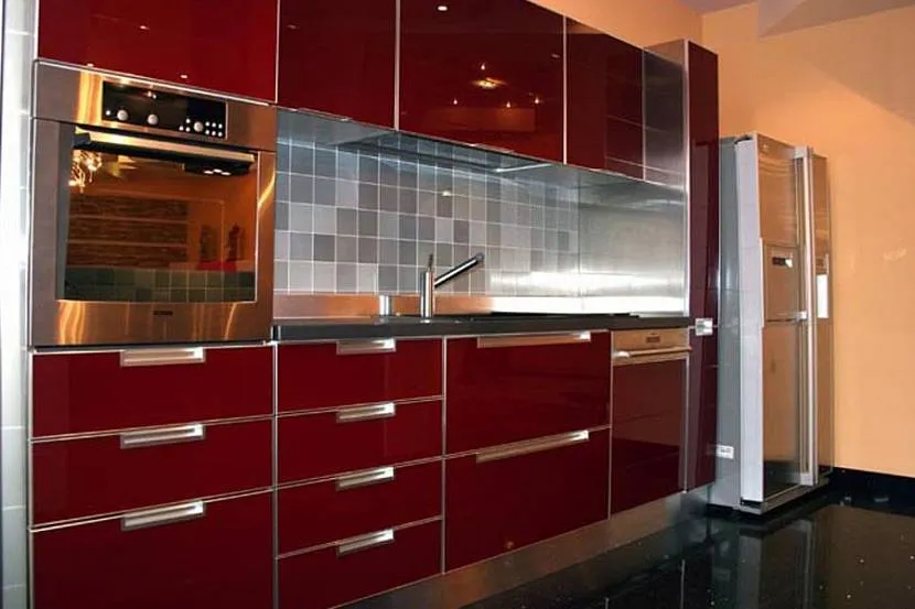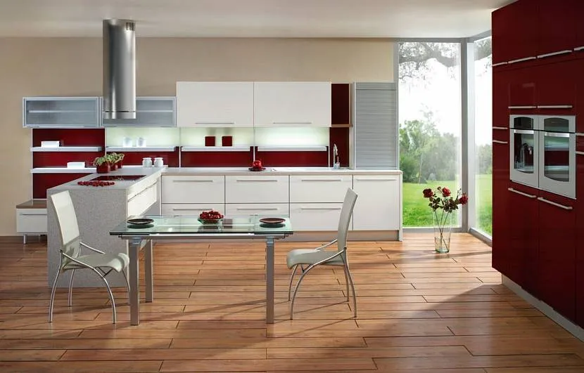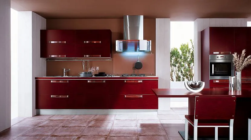 Дизайнеры выбирают один из трех вариантов ввода бордового цвета в оформление кухни: мебельные фасады, отделка стен/потолка или пола. При этом потолок лучше оставить светлым, а пол выложить плиткой или керамогранитом цвета бордо.
