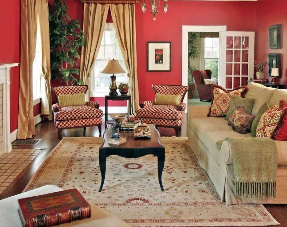 Естественно, помещение не будет сплошь окрашено только красным. Стены, пол, предметы обстановки и различные аксессуары будут выполнены в другой цветовой гамме. Поэтому, необходимо выяснить, какие цвета составят наилучшие комбинации со столь насыщенным тоном потолка. Самыми удачными станут следующие сочетания: