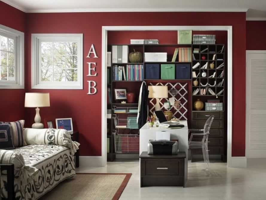 Отдельное помещение под кабинет выделяют в частных домах или просторных квартирах. Бордовый цвет в интерьере рабочей комнаты добавит хозяину солидности. Полностью погружаться в бордовую атмосферу не рекомендуется, так как яркие детали не позволят «с головой» уйти в работу, но несколько глубоких и сочных акцентов отвлекут от рутины и помогут найти неожиданные решения. В кабинете престижно смотрится кожаный диван в темных вариантах бордового, обои с золоченым рисунком или тяжелые портьеры.