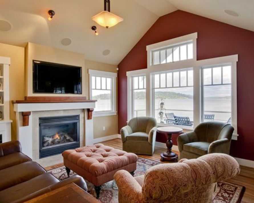 Коричневый с бордовым цветом является самым устойчивым и классическим интерьерным сочетанием. Оно ассоциируется с поздней осенью, уютом и защищенностью, горячим шоколадом, зрелыми яблоками, порой созерцания и неспешности. В этой гостиной мы видим бордовый в сочетании с ягодными цветами – черничным, клюквенным, малиновым, а цвет ковра и обивки мебели напоминают молочную пенку на капучино. Такой вариант будет одинаково хорошо смотреться как в маленьких, так и в больших комнатах, предназначенных для отдыха.