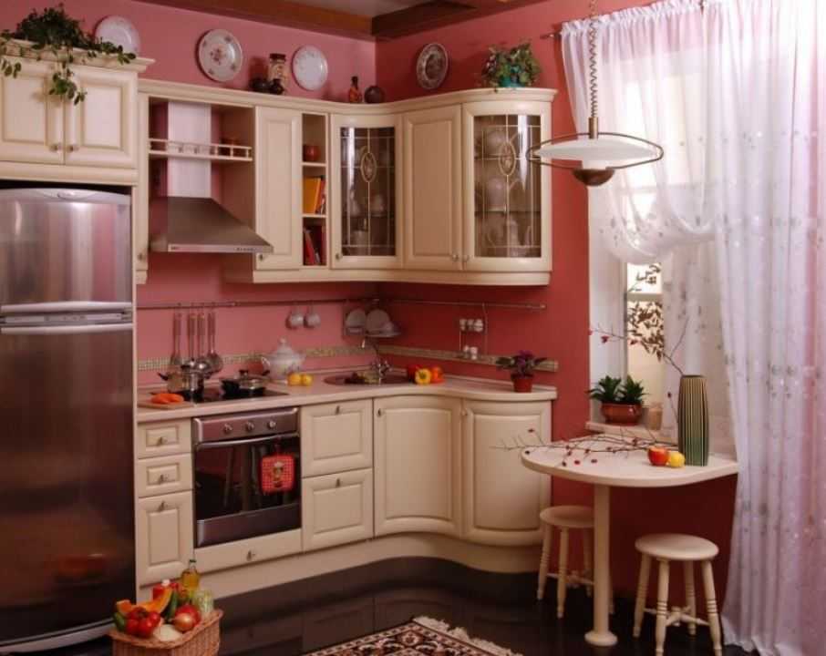 Пастельно-карминные стены кухни оттеняют бежевую мебель