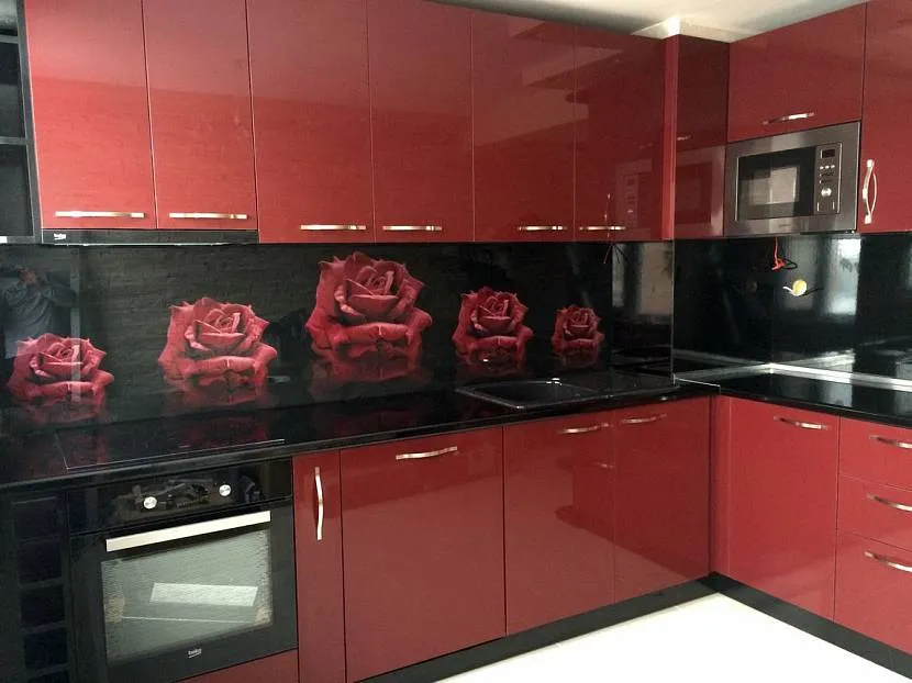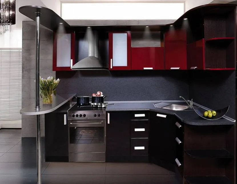 Соединение этих тонов должно быть взвешенным и хорошо продуманным, ведь в противном случае помещение приобретет мрачный, «траурный» вид. Для того, чтобы подчеркнуть все достоинства такого решения, возьмите за базовый тон оформления белый или бежевый оттенок. Отлично выглядит мебель с бордовым низом, черной столешницей и белоснежными фасадами верхних модулей. «Разбавить» черно-бордовую гамму поможет яркий кухонный фартук, стулья, стол в светлых тонах.