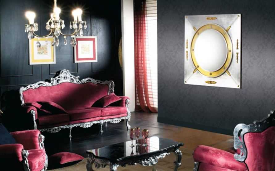 В современных стилях бордовый цвет чаще встречается в сочетании с бежевым или черным. На бордовой стене оригинально выглядит зеркало в затейливой золоченой или посеребренной раме, а также знаменитое зеркало-солнце.