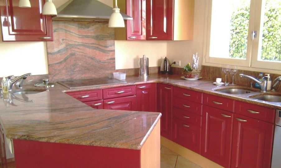 Рядом с бордовой мебелью должны присутствовать контрастные тона, желательно светлые. Например, столешницы из натурального камня или деревянные элементы