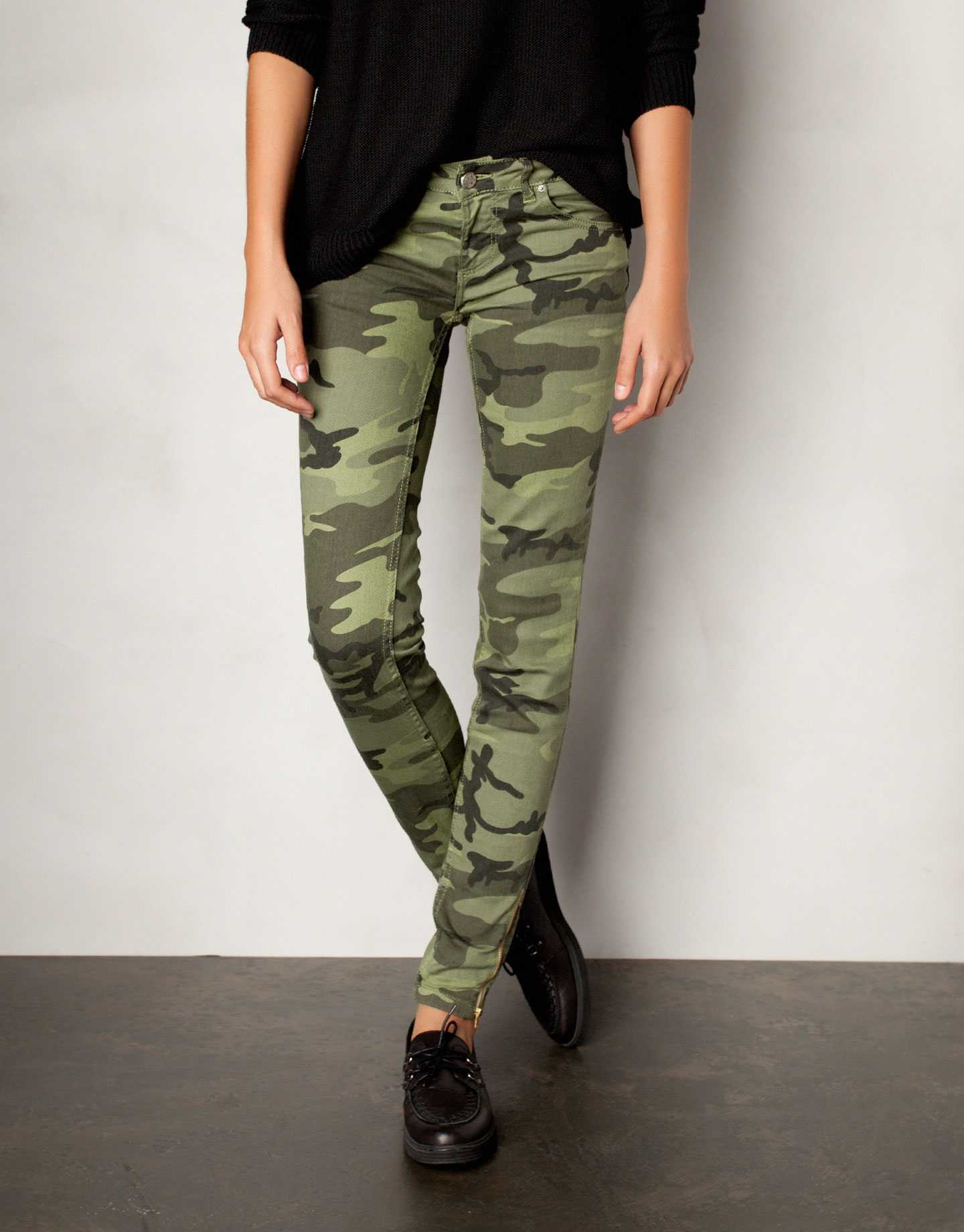 Практически в каждом варианте присутствует оригинальный камуфляжный принт. Если такое изделие нужно сделать основным акцентом армейского комплекта, аксессуары должны быть броскими. Вещи из денима – лучше дополнение камуфляжных принтов. Футболка с курткой защитного, коричневого, серого или черного цвета – гармонично смотрится на фоне камуфляжного низа. Облегающие модели шикарно вписываются в кэжуал стиль, легко дополняются майками, рубашками и блузами.