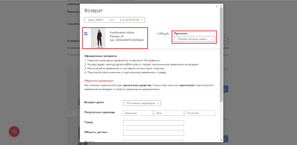 При оформлении заявки на возврат товара в Ламода в режиме онлайн, вносить данные о конкретном товаре не будет необходимости. В разделе «Мои заказы» вам нужно будет просто выбрать позиции, которые вы хотите выслать обратно продавцу. После заполнения информации о методе возврата денежных средств форма будет отправлена вам на электронную почту. Вам необходимо будет распечатать этот бланк и подписать его, после чего подготовить остальные документы, необходимые для возврата.