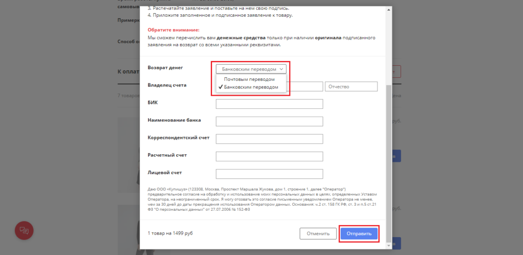 - Выберите способ возврата денежных средств — банковский или почтовый перевод. Заполните все поля и нажмите «Отправить».