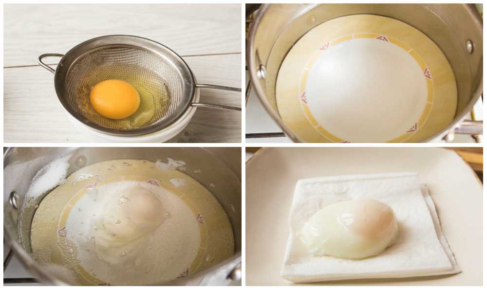(Соль нужна для придания вкуса яйцу, но она уменьшает блеск белка и делает его более матовым. Уксус нужен при использовании не очень свежего яйца — он уменьшает растекание белка. Если готовить яйцо по классической рецептуре, то в воду ничего добавлять не нужно. А также вместо воды можно использовать бульон, молоко, вино и пр.)