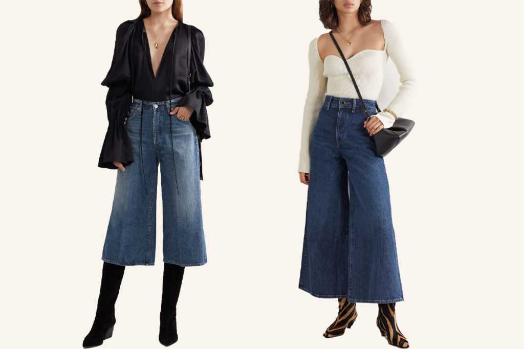Длина чуть ниже колена либо чуть выше щиколотки. Широкая штанина. Такие джинсы лучше носить с высоким каблуком, чтобы не укорачивать визуально рост. Обувь лучше подбирать менее массивную, более женственную. Модный вариант — носить джинсы-кюлоты с сапогами, уходящими под них.