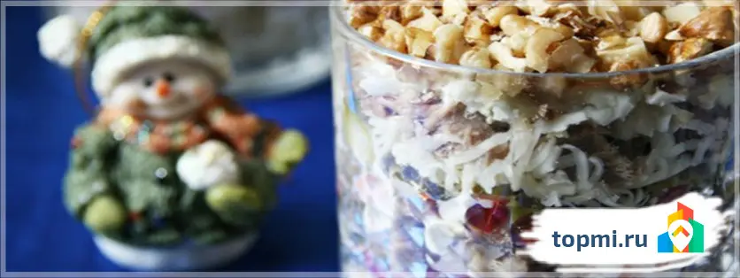 Это еще один салат, который оформляется тематически в виде часов, на которых указано без пяти двенадцать. Угощение истинно новогоднее, которое создает необходимую праздничную атмосферу, выкладывается слоями.
