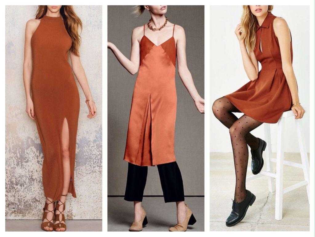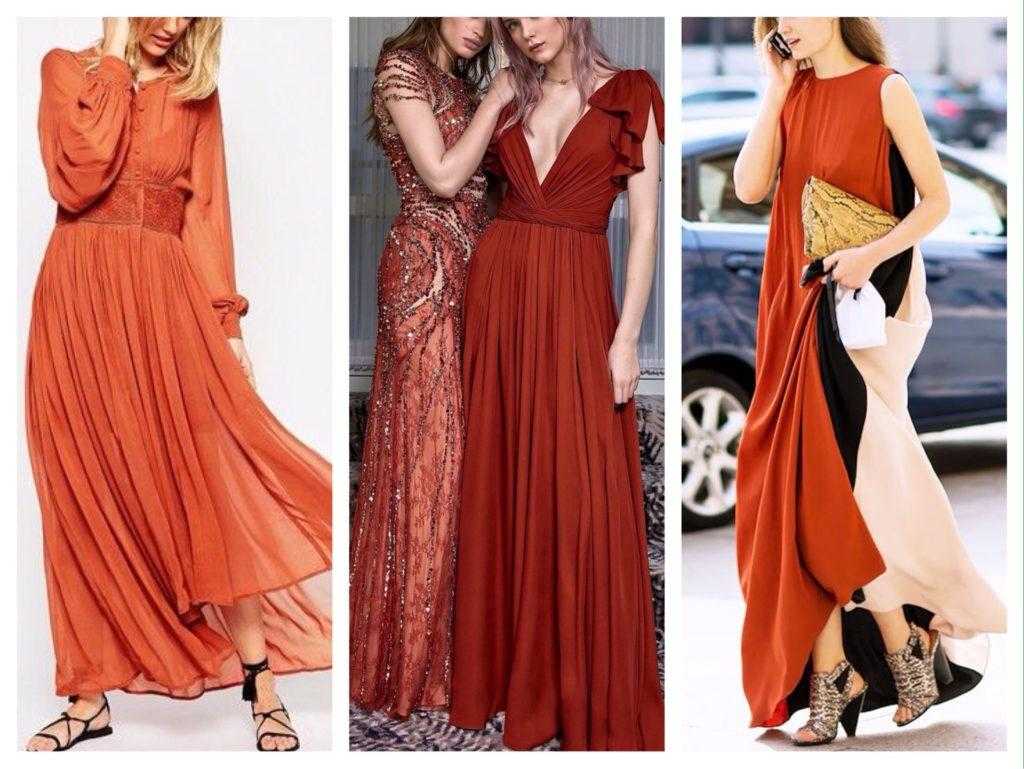 Платье под пальто терракотового цвета нужно выбирать роскошное в своей простоте. Необычный крой, стильность «бохо», греческие и римские с завышенной талией, восточные с принтом – их предназначение во многом определяет длина: