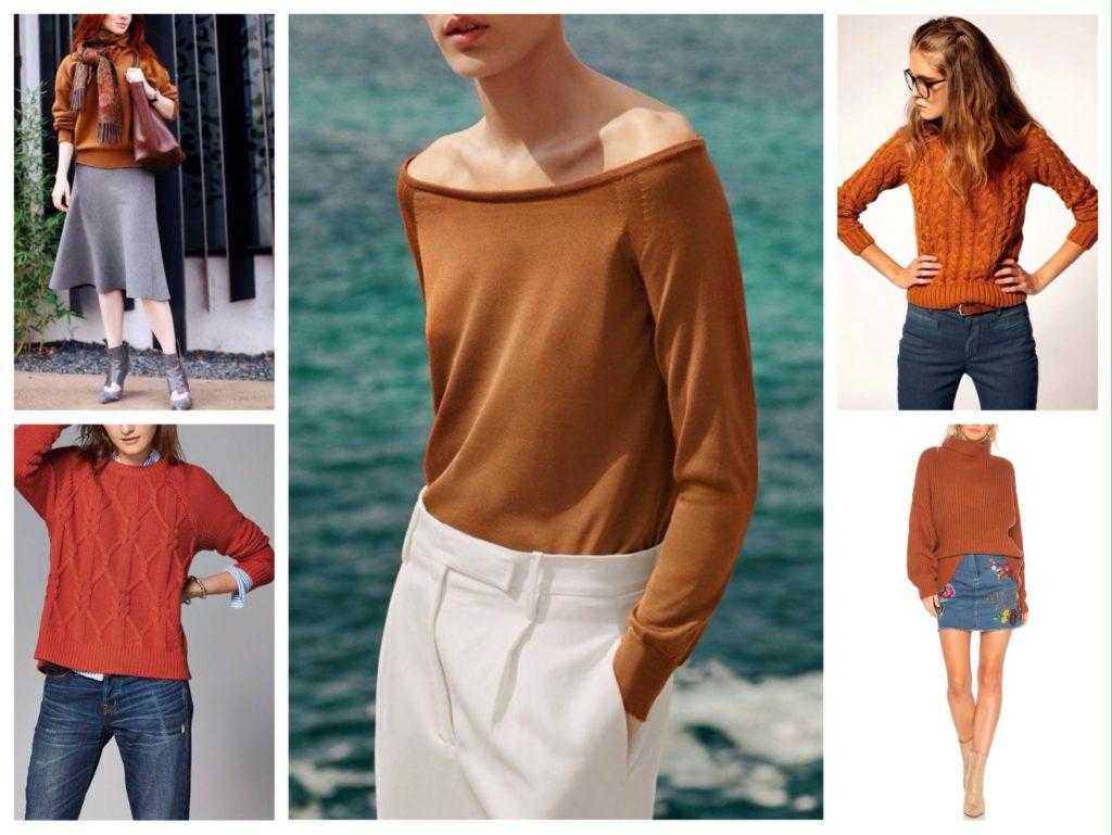 Свитер или джемпер кирпичного оттенка отлично смотрится с денимом, белыми классическими брюками.