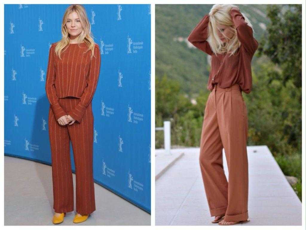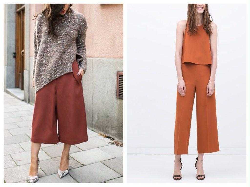 Терракотовый total look с брюками или кюлотами поможет визуально вытянуть силуэт.