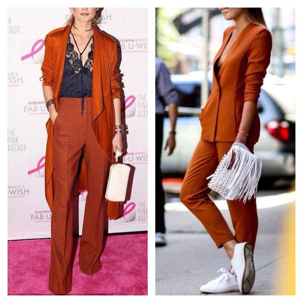 Акценты с брючным костюмом терракотового цвета могут быть в белом, черном, золотом оттенке.
