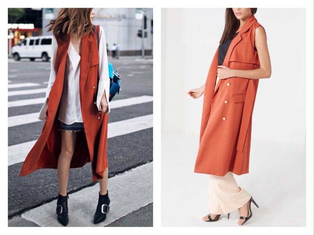 Терракотовый пиджак или жилет в дуэте с белым топом или блузой создадут нарядный комплект для городского образа.