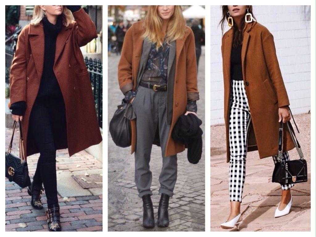 Родственные цвета хорошо ладят между собой. Вот и коричневый к терракоте подходит как ключик к замочку. Это теплый вариант на осенние солнечные дни. Коричневые аксессуары – сумочка, шарф, перчатки – подойдут и к другим комплектам, а лучше всего – к комбинации терракотовых вариаций с белым цветом.