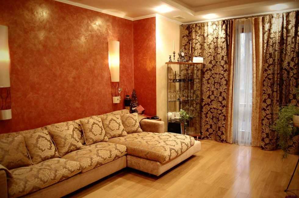 Отделка стен терракотовой краской в гостинойИсточник ekaterinburg.manders.ru
