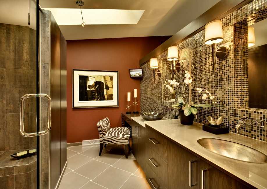 Для пола лучше использовать терракотовую кафельную или керамогранитную плитку. Главное, чтобы оттенок был светлее остальных поверхностей на несколько тонов. Не забываем про потолок. Его лучше оставлять максимально классическим, используя для оформления только нейтральные тона: бежевый, кремовый, светло-серый, соломенный или белый. Слишком темные или насыщенные цвета будут давить.