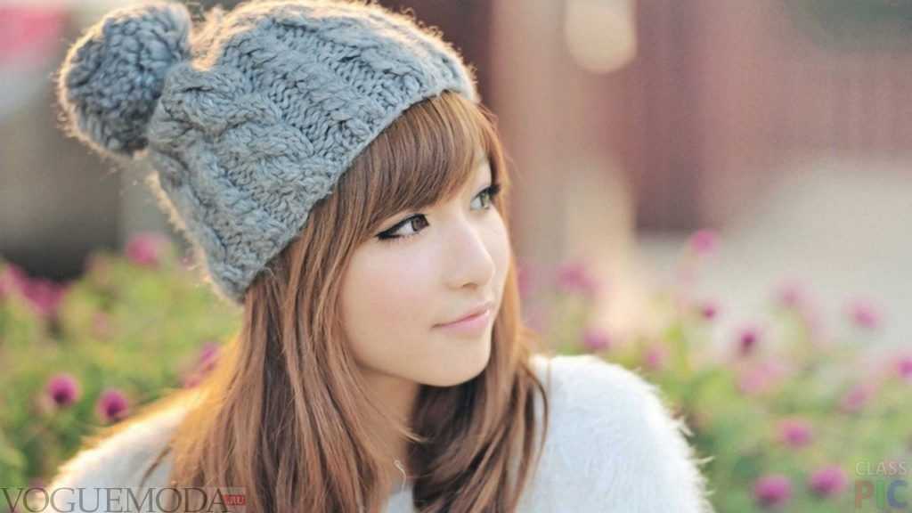 Выигрышнее всего выглядят вязаные шапки в комбинации с прической из длинных волос или средней длины. С густой челкой до бровей или асимметричной, слегка зачесанной набок. Не очень густые челки лучше закалывать, прежде чем надевать вязаную шапку.