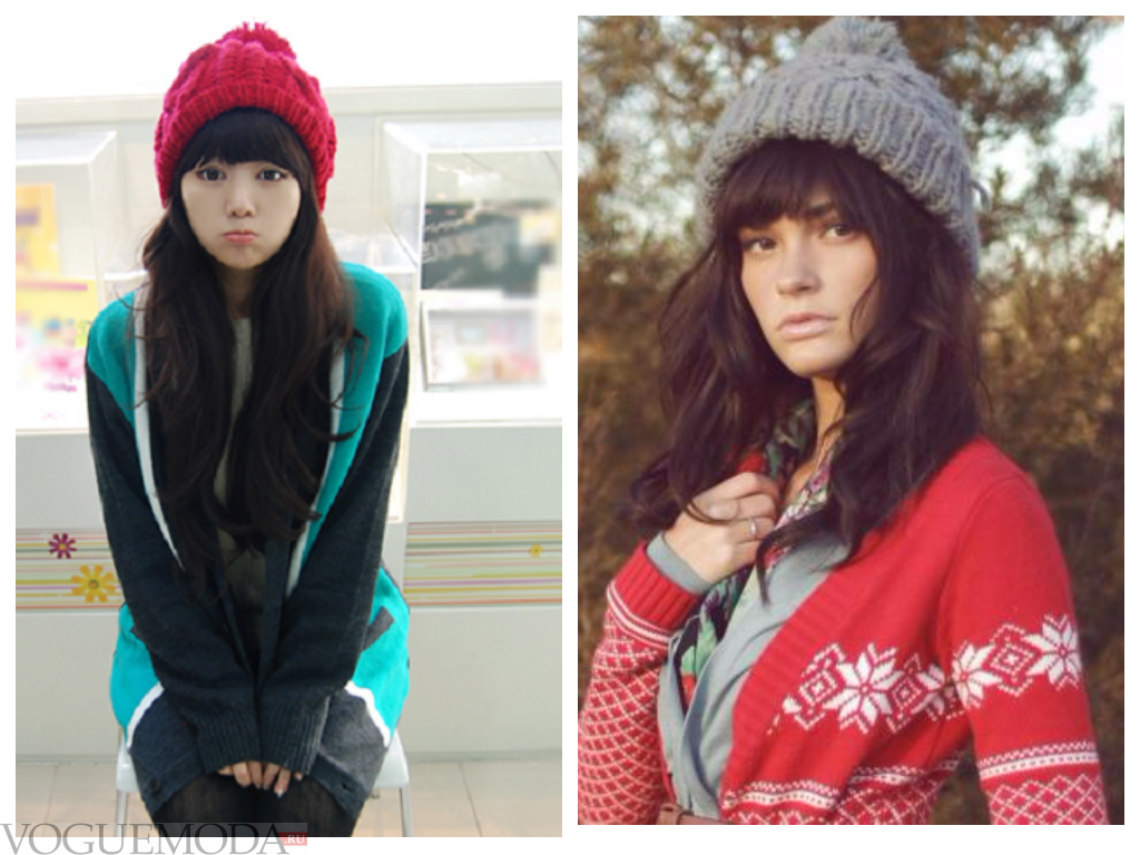 После того, как челки снова вошли в моду, проблема подходящих головных уборов стала насущной для многих девушек. Вязанные шапки бывают разные – от объемных крупной вязки с узорами, пестрых, до гладких без декора.