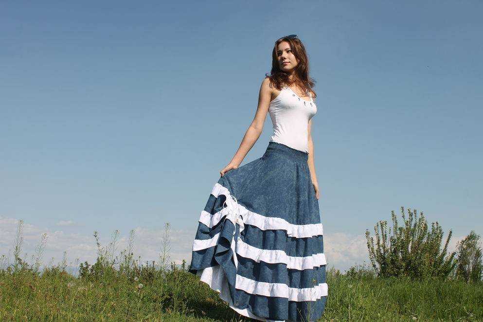 Джинсовая юбка бохо чаще всего имеет длину в пол. Она может быть украшена лоскутками ткани, кружевом, шелковыми или шифоновыми вставками. Идеально сочетается с топами, майками, хлопковыми рубашками. Такой образ подходит для неформальных встреч и прогулок.