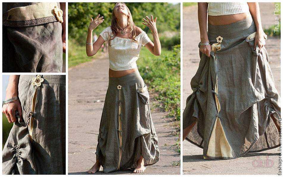 Огромной популярностью пользуются льняные юбки. Натуральный материал, этнические нотки, отделка кружевом — такой наряд выглядит стильно и дорого. Также хлопок, лен часто декорируются вышивкой или бисером. Эти элементы превосходно смотрятся на тканях оливкового, бежевого, серо-голубого и молочного оттенков.