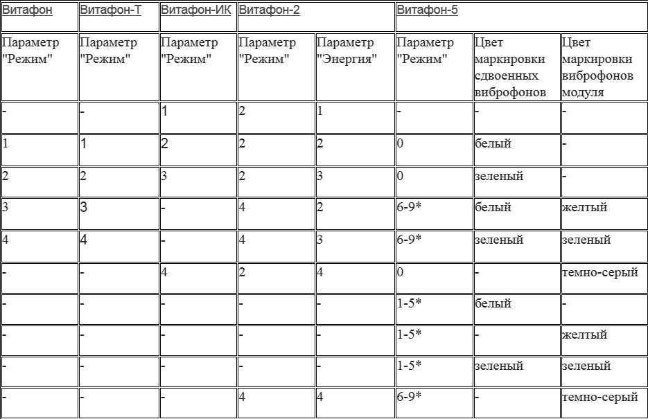 Значения со звездочкой в столбце Витафон-5 означает постепенное нарастание мощности от 1 до 5 и.т.д