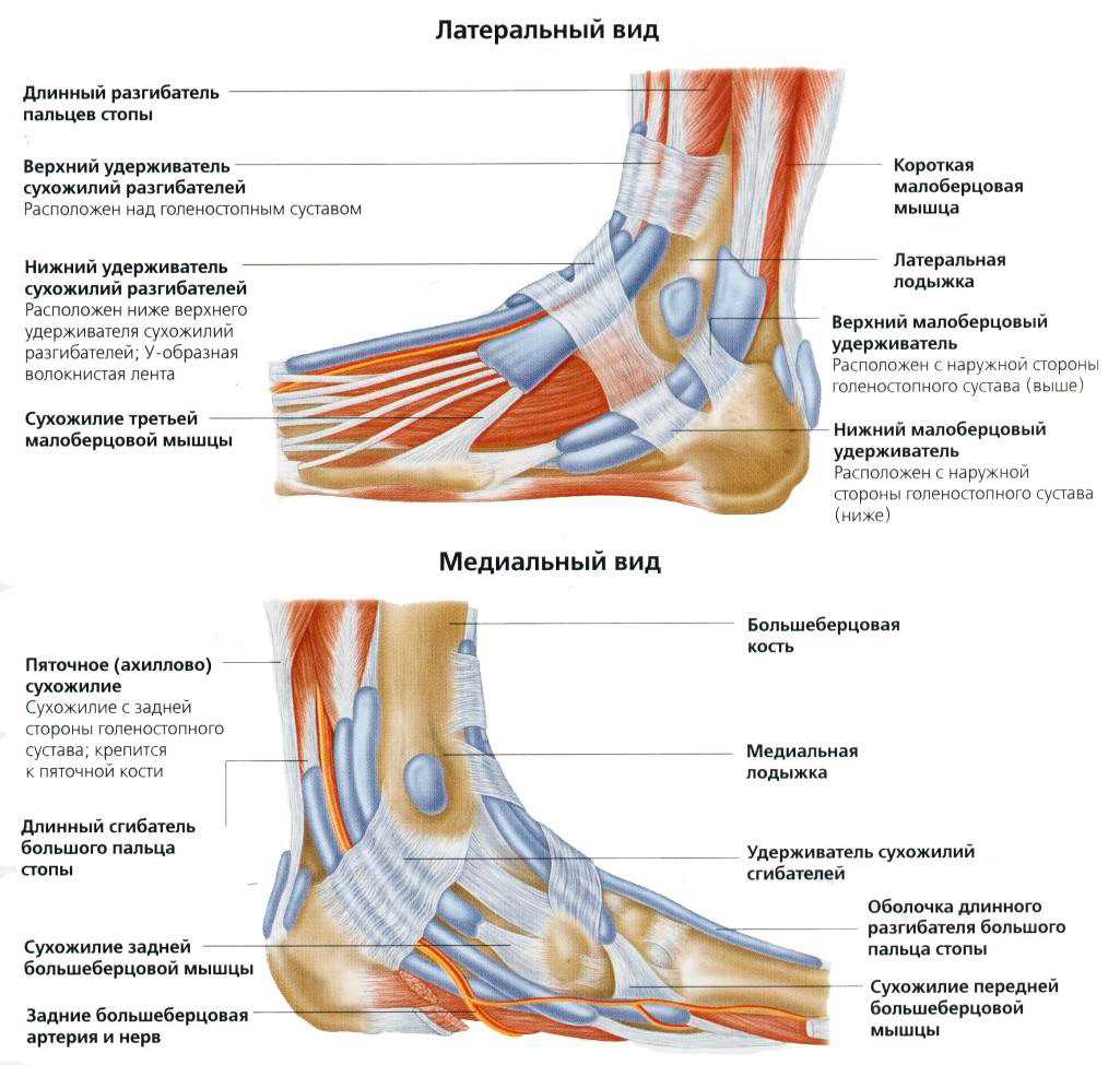 Укрепляют и поддерживают суставную функцию мышцы разгибатели и сгибатели стопы, переходящие в сухожилия, прикрепляющиеся к костям стопы (к суставу они не прикрепляются). Мышцы-разгибатели идут выше и спереди сустава, сгибатели – позади медиальной лодыжки, мышцы малоберцовой кости – позади внешней латеральной лодыжки. Каждая группа мышц удерживается в нужном положении тонкими широкими лентами соединительной ткани – удерживателями.